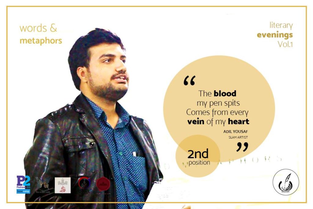Almost a year later, Daastan powered what was to become the signature event series of Words and Metaphors, titled “Literary Evenings”. The idea was to initiate a chain of events solely focused on encouraging the literature invested local community artists, and bring their work out into the open. The first volume of Literary Evenings, held in the city of Peshawar, had a two-tiered agenda. The first, was to hold a Poetry Slam Contest between the poets of the city, in both Urdu and English. The contest was divided into three rounds, each with its own unique theme to challenge the performer and their written content. A panel of three exceptionally qualified judges was assembled, which consisted of a research scholar pursuing her MPhil in Literature, Founder Daastan, and Co-founder Words and Metaphors, each especially suited to evaluate the poet’s abilities of speech, written word and body language.
